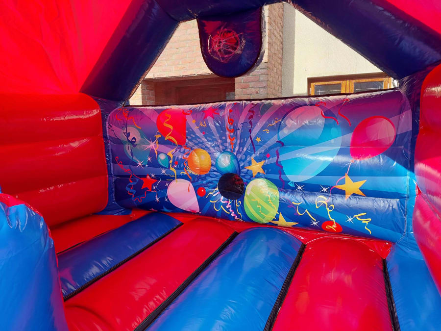 Our party themed bouncing castle is blue and purple and has fantastic artwork on all walls and has a spacious bouncing area with a roof and a slide to the front. It is perfect for smaller children, however it is suitable for children of all ages.