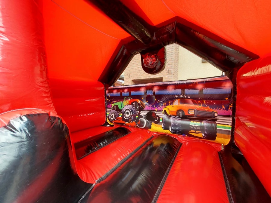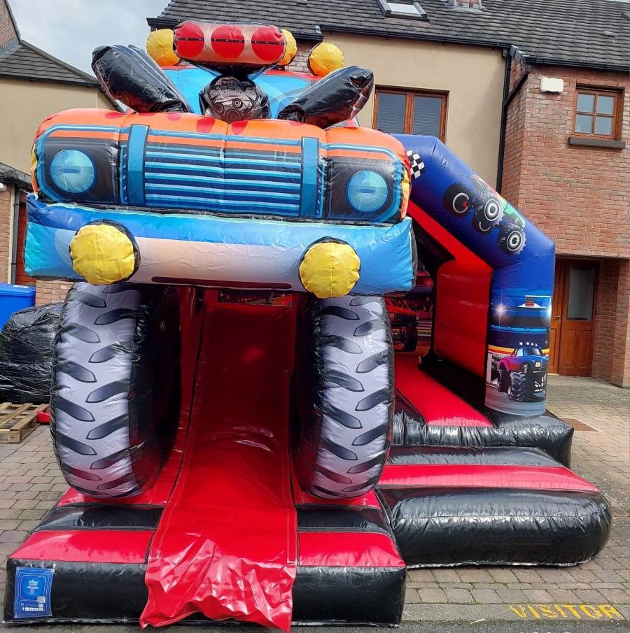 If you are looking for the perfect inflatable for your cars and truck mad little ones then hire one of our fantastic 3D combos! This bouncy castle with a slide is just what you need for your monster truck themed party. With its fantastic 3D front and amazing artwork of monster trucks inside. Hire available across Dublin ,Leixlip , Kilcock , Celbridge , Maynooth , Lucan , Dunboyne , Straffan